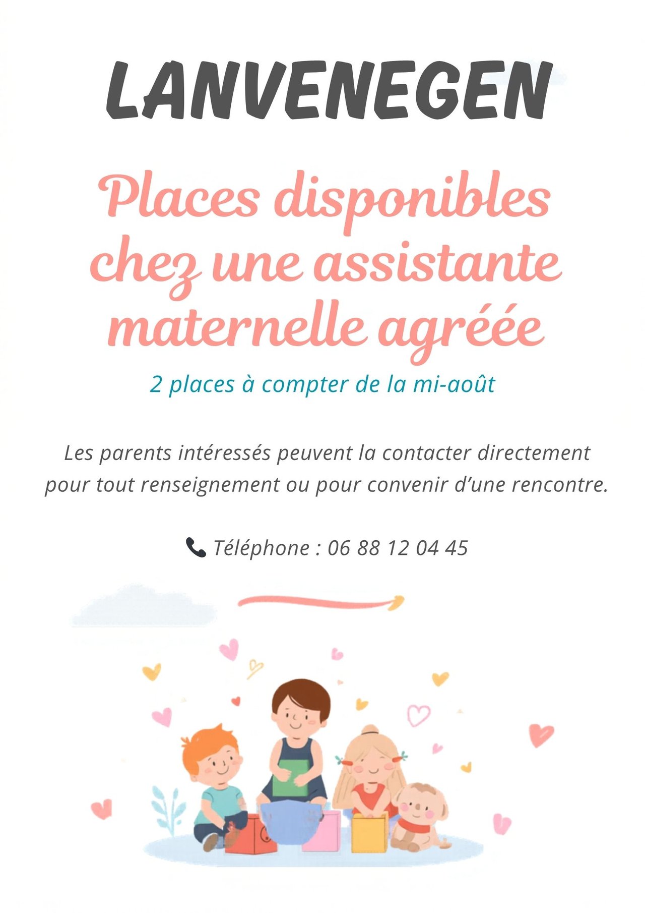 Une assistante maternelle agréée de la commune, Vanessa, informe les familles que deux places d’accueil seront disponibles à partir de la mi-août.