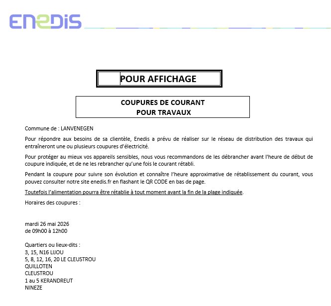 Enedis vous informe de coupures de courant pour travaux concernant la commune de LANVENEGEN le mardi 26 mai 2026.