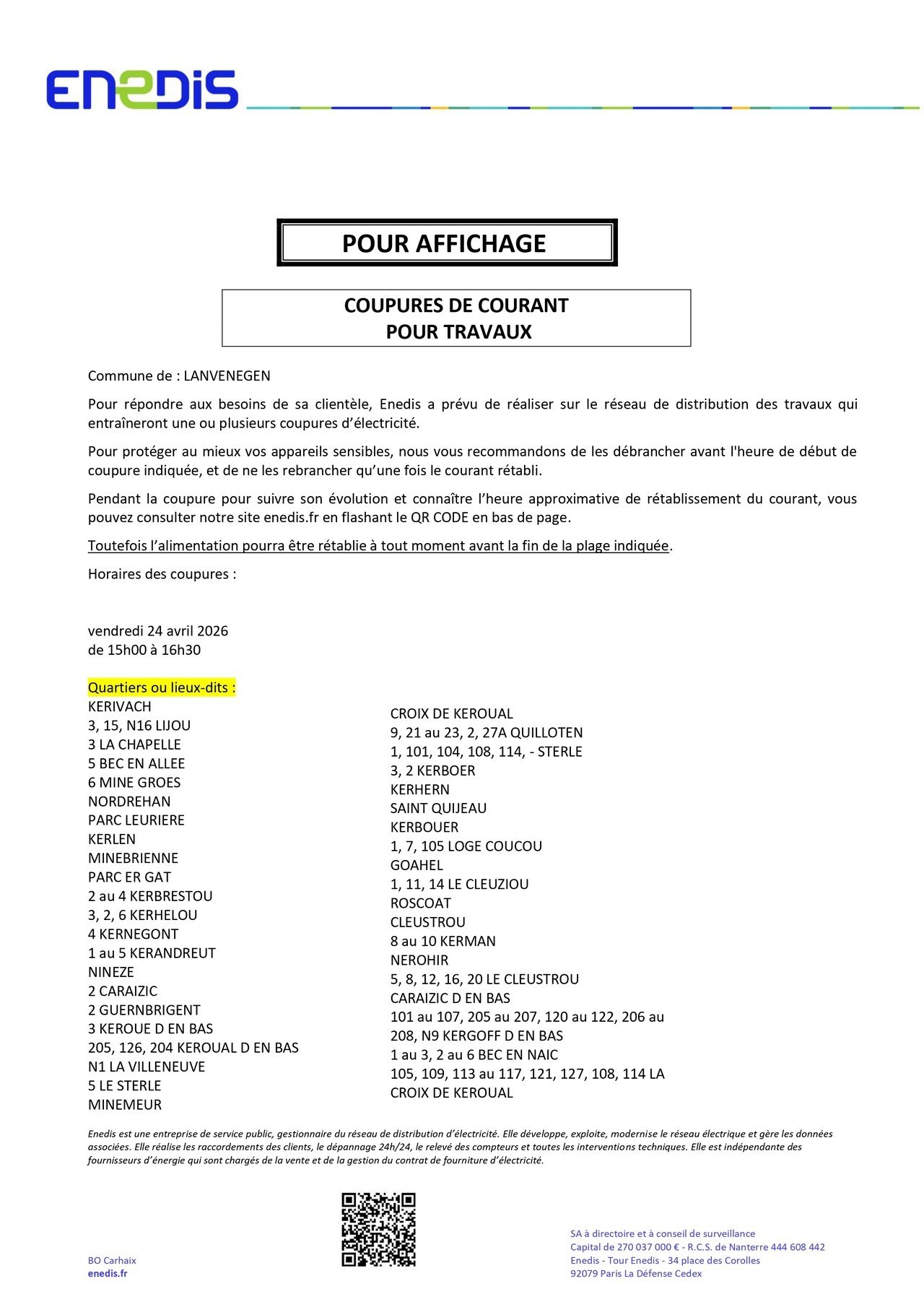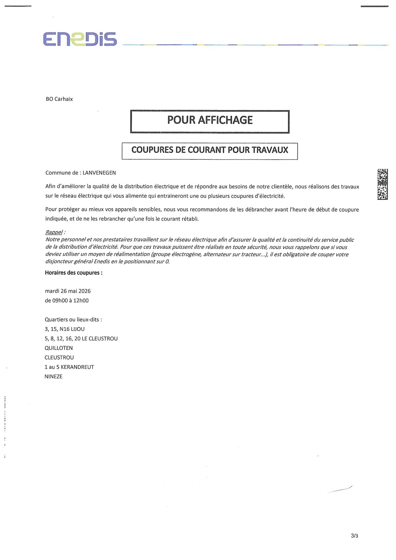 Enedis vous informe de coupures de courant pour travaux concernant la commune de LANVENEGEN le mercredi 26 mai et le vendredi 29 mai 2026.